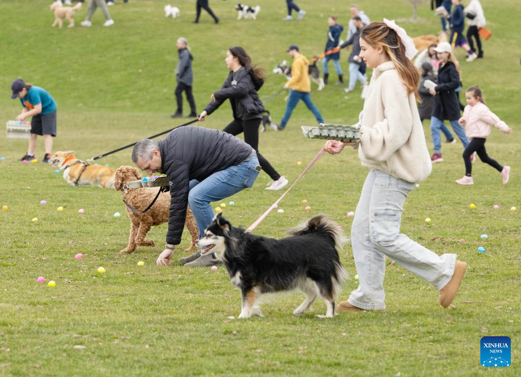 HAMILTON, 18 abril, 2025 (Xinhua) -- Perros mascota buscan huevos junto a sus dueños durante la Búsqueda de Huevos de Pascua para Perros 2025, en Hamilton, Ontario, Canadá, el 18 de abril de 2025. (Xinhua/Zou Zheng)
