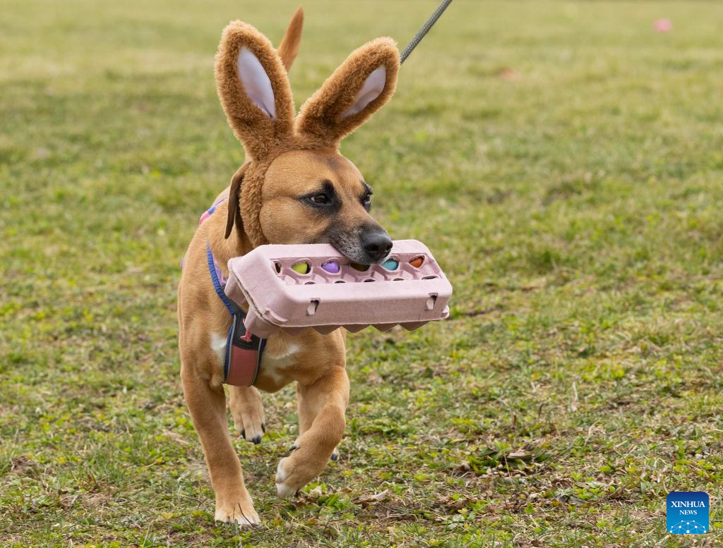 HAMILTON, 18 abril, 2025 (Xinhua) -- Un perro mascota con una decoración de orejas de conejo muerde un empaque de huevos durante la Búsqueda de Huevos de Pascua para Perros 2025, en Hamilton, Ontario, Canadá, el 18 de abril de 2025. (Xinhua/Zou Zheng)