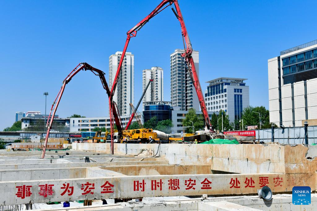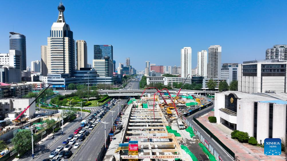 JINAN, 19 abril, 2025 (Xinhua) -- Imagen del 19 de abril de 2025 del recubrimiento de la estructura principal de la Estación de Paso Elevado Bayi de la Línea 4 del Metro de Jinan (Fase I), en Jinan, en la provincia de Shandong, en el este de China. Con el exitoso recubrimiento de la estructura principal de la Estación de Paso Elevado Bayi, la construcción de la estructura principal de la Línea 4 del Metro de Jinan (Fase I) ha sido completada. (Xinhua/Guo Xulei)