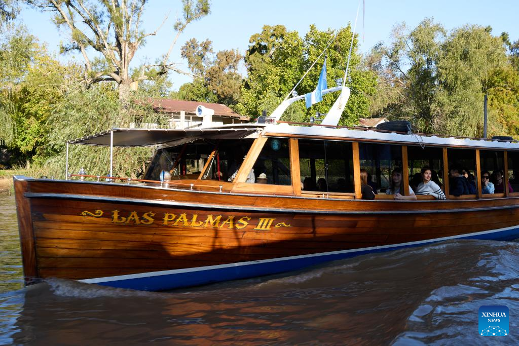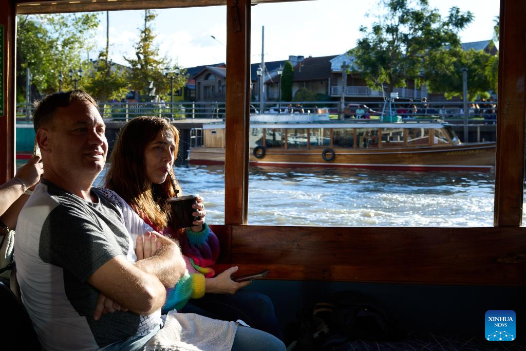 TIGRE, 19 abril, 2025 (Xinhua) -- Imagen del 18 de abril de 2025 de turistas realizando un recorrido en bote por un río, en Tigre, Argentina. (Xinhua/Meng Dingbo)