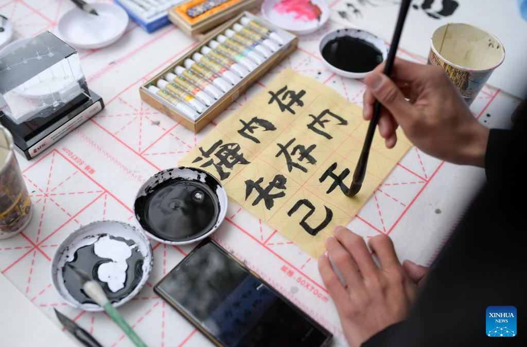 ALMATY, 19 abril, 2025 (Xinhua) -- Un hombre escribe caracteres chinos en el evento del Día Internacional del Idioma Chino 2025, en Almaty, Kazajistán, el 19 de abril de 2025. Un evento de celebración para conmemorar el Día Internacional del Idioma Chino 2025 se llevó a cabo aquí el sábado, ofreciendo una experiencia cultural inmersiva que combinó la caligrafía china, la pintura tradicional china, el Hanfu y la interpretación del Guzheng (cítara pulsada china). (Xinhua/Li Renzi)