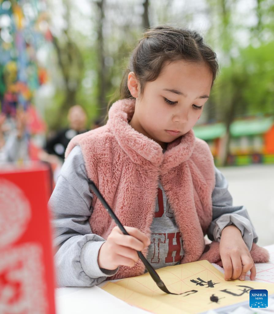 ALMATY, 19 abril, 2025 (Xinhua) -- Una niña aprende a escribir caracteres chinos en el evento del Día Internacional del Idioma Chino 2025, en Almaty, Kazajistán, el 19 de abril de 2025. Un evento de celebración para conmemorar el Día Internacional del Idioma Chino 2025 se llevó a cabo aquí el sábado, ofreciendo una experiencia cultural inmersiva que combinó la caligrafía china, la pintura tradicional china, el Hanfu y la interpretación del Guzheng (cítara pulsada china). (Xinhua/Li Renzi)