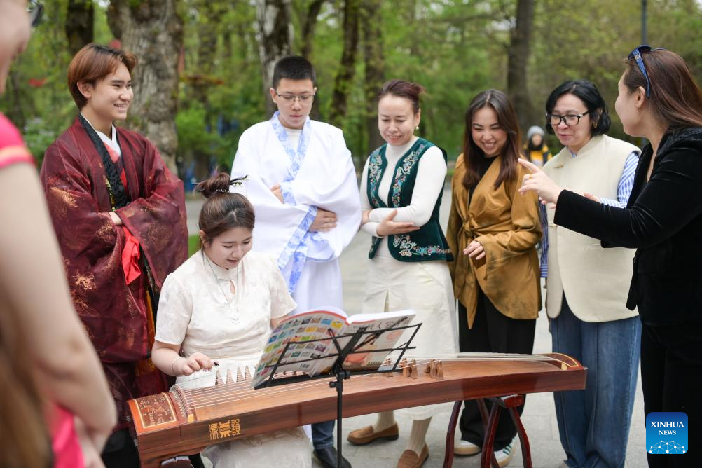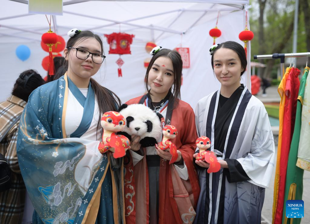 ALMATY, 19 abril, 2025 (Xinhua) -- Personas portan trajes con elementos chinos mientras posan para fotografías en el evento del Día Internacional del Idioma Chino 2025, en Almaty, Kazajistán, el 19 de abril de 2025. Un evento de celebración para conmemorar el Día Internacional del Idioma Chino 2025 se llevó a cabo aquí el sábado, ofreciendo una experiencia cultural inmersiva que combinó la caligrafía china, la pintura tradicional china, el Hanfu y la interpretación del Guzheng (cítara pulsada china). (Xinhua/Li Renzi)