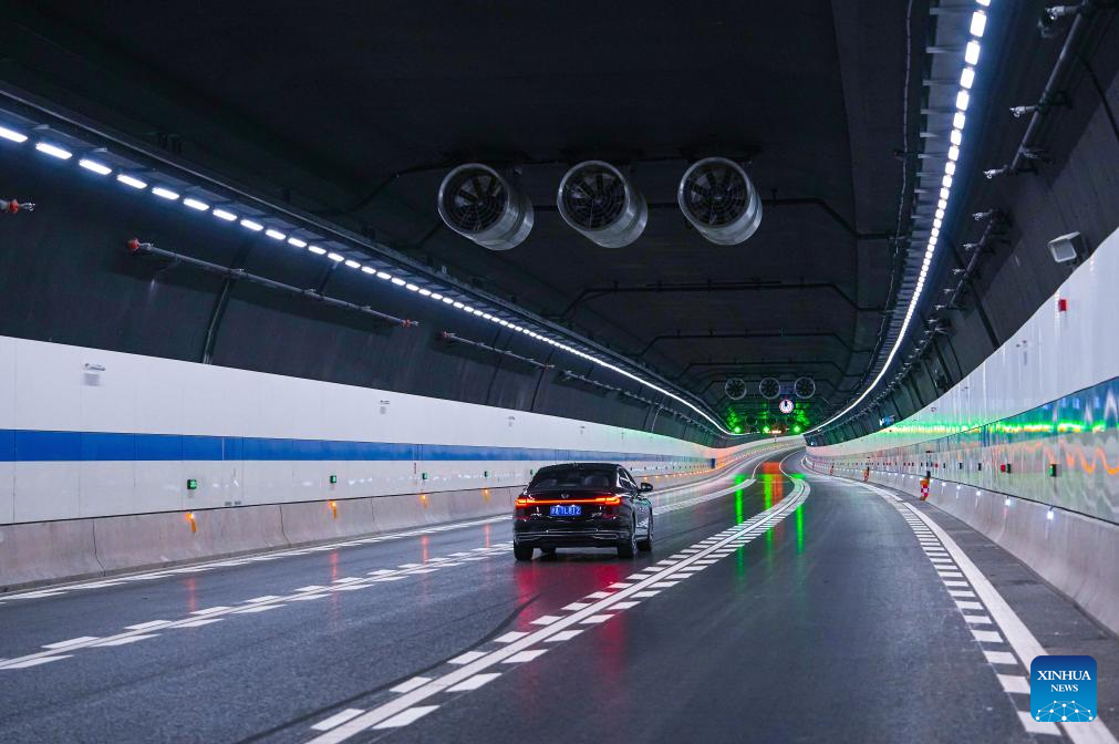 BEIJING, 20 abril, 2025 (Xinhua) -- Un vehículo circula en el interior de un túnel escudo a lo largo de la sexta carretera de circunvalación este, en Beijing, capital de China, el 20 de abril de 2025. El proyecto de renovación de la sexta carretera de circunvalación este de Beijing se abrió al tráfico el domingo después de su finalización completa. La sección renovada tiene una longitud aproximada de 16,3 kilómetros, incluyendo un túnel escudo de 7,4 kilómetros. El proyecto contribuye a mejorar el transporte por autopista en la zona central del distrito de Tongzhou, en el subcentro de Beijing. (Xinhua/China Railway 14th Bureau Group Co., Ltd.)