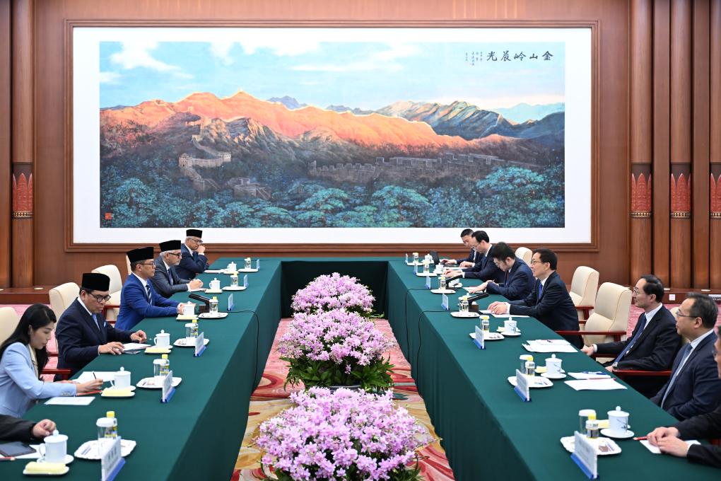 El vicepresidente chino, Han Zheng, se reúne con el ministro de Relaciones Exteriores de Indonesia, Sugiono, en Beijing, capital de China, el 21 de abril de 2025.
