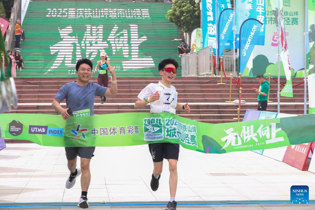 CHONGQING, 20 abril, 2025 (Xinhua) -- Imagen del 13 de abril de 2025 de corredores cruzando la línea de meta en una carrera llevada a cabo, en el distrito de Jiangbei, en Chongqing, en el suroeste de China. Ansiosos por liberarse de los confines del invierno, los chinos están adoptando actividades al aire libre, mientras la primavera ofrece oportunidades infinitas para mantenerse en forma y disfrutar de la belleza de la naturaleza. Con el aumento de las temperaturas, los maratones, el ciclismo, la pesca y la acampada han transformado parques y distritos comerciales en vibrantes centros de actividad, impulsando una dinámica ola de consumo. (Xinhua)