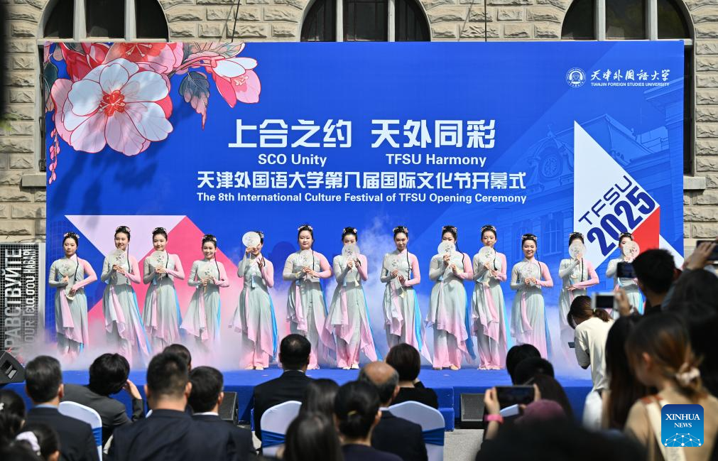 TIANJIN, 20 abril, 2025 (Xinhua) -- Imagen del 20 de abril de 2025 de una presentación escenificada durante el 8° Festival Internacional de Cultura de la Universidad de Estudios Extranjeros, en Tianjin, en el norte de China. Más de 300 estudiantes y profesores de más de 60 países y regiones participaron en el festival. (Xinhua/Sun Fanyue)