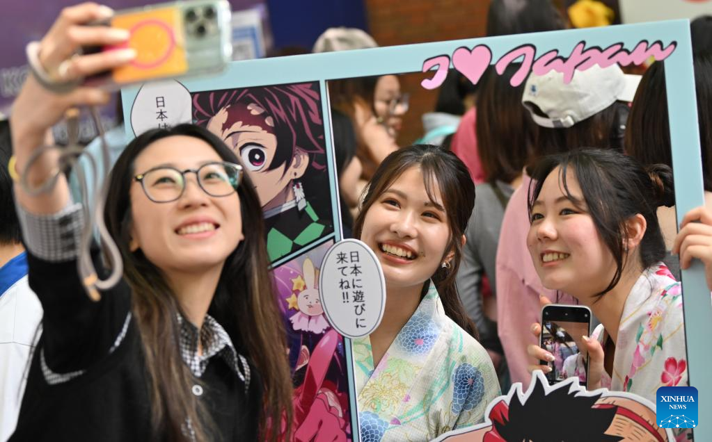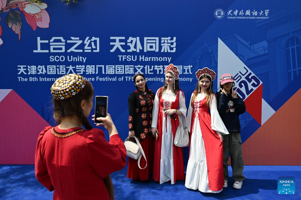 TIANJIN, 20 abril, 2025 (Xinhua) -- Estudiantes se toman fotografías durante el 8° Festival Internacional de Cultura de la Universidad de Estudios Extranjeros, en Tianjin, en el norte de China, el 20 de abril de 2025. Más de 300 estudiantes y profesores de más de 60 países y regiones participaron en el festival. (Xinhua/Sun Fanyue)