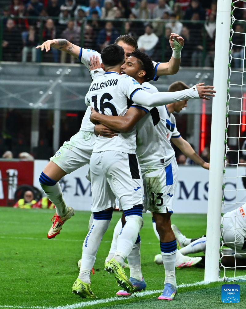 MILAN, 21 abril, 2025 (Xinhua) -- Imagen del 20 de abril de 2025 de Ederson (d), de Atalanta, festejando su anotación con sus compañeros durante el partido de fútbol de la Serie A entre AC Milan y Atalanta, en Milán, Italia. (Xinhua)