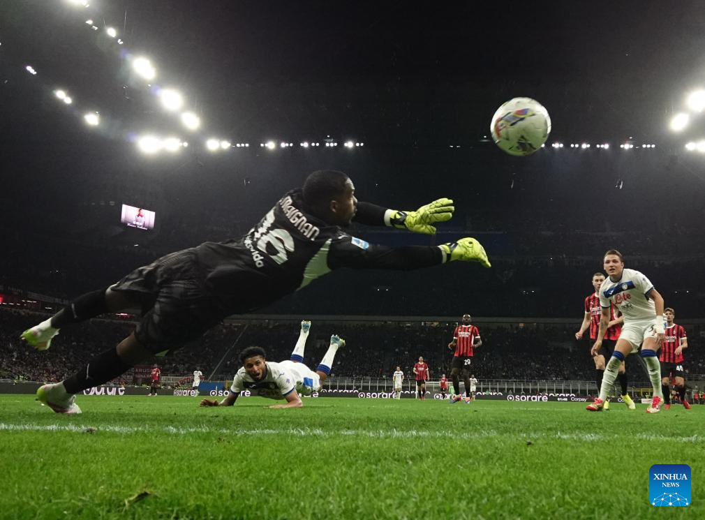 MILAN, 21 abril, 2025 (Xinhua) -- Imagen del 20 de abril de 2025 de Ederson (abajo), de Atalanta, cabeceando para realizar su anotación durante el partido de fútbol de la Serie A entre AC Milan y Atalanta, en Milán, Italia. (Xinhua)