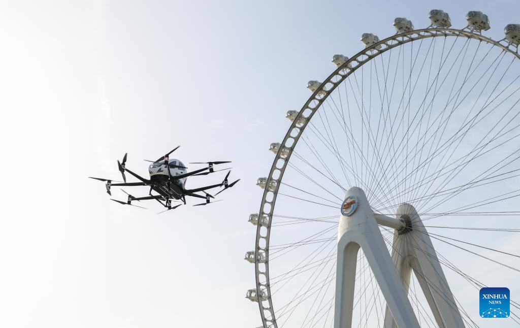 SHENZHEN, 22 abril, 2025 (Xinhua) -- Imagen del 16 de abril de 2025 de una aeronave eléctrica de despegue y aterrizaje vertical, desarrollado por el fabricante chino de drones EHang, realizando un vuelo de demostración en el centro de demostración de operaciones de tránsito aéreo urbano, en el distrito de Bao'an, en Shenzhen, en la provincia de Guangdong, en el sur de China. Aprovechando sus ventajas de ubicación únicas, sus sólidos cimientos industriales y un entorno de crecimiento abierto e inclusivo, la Gran Area de la Bahía de Guangdong-Hong Kong-Macao ha dado en los últimos años pasos firmes hacia nuevas competencias. (Xinhua/Mao Siqian)
