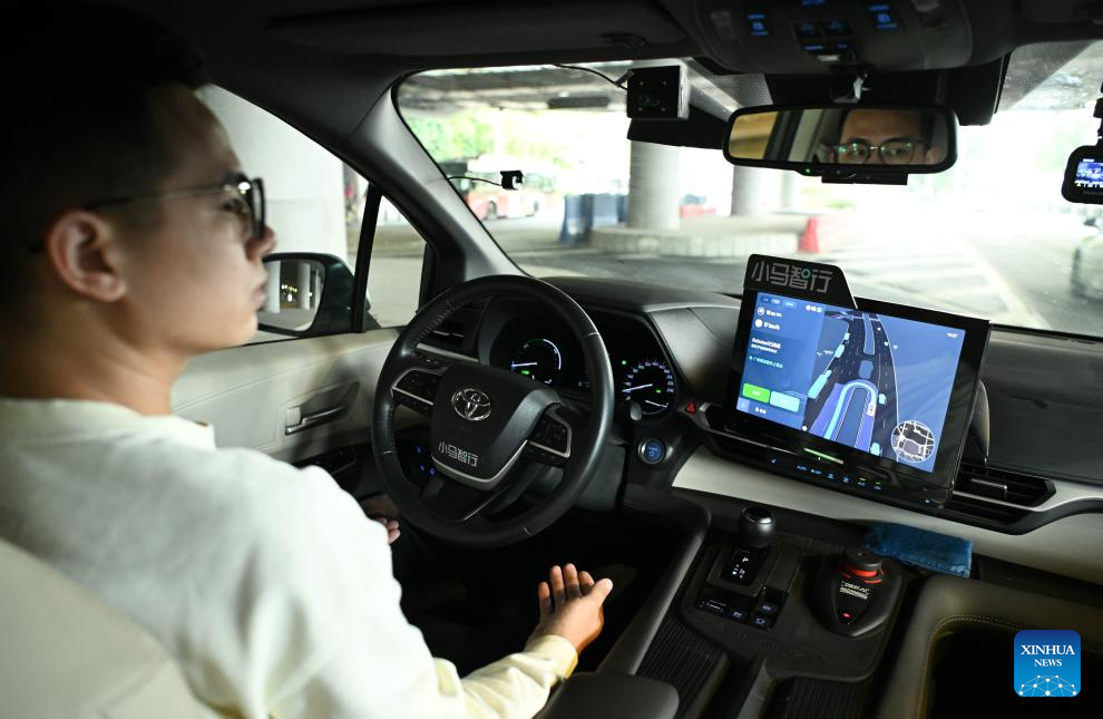 GUANGZHOU, 22 abril, 2025 (Xinhua) -- Imagen del 11 de marzo de 2025 de un trabajador de seguridad observando cómo un robotaxi de Pony.ai, un proveedor chino de soluciones de conducción autónoma, se dirige automáticamente en un punto de parada en la Torre de Cantón, un punto emblemático en Guangzhou, en la provincia de Guangdong, en el sur de China. Aprovechando sus ventajas de ubicación únicas, sus sólidos cimientos industriales y un entorno de crecimiento abierto e inclusivo, la Gran Area de la Bahía de Guangdong-Hong Kong-Macao ha dado en los últimos años pasos firmes hacia nuevas competencias. (Xinhua/Deng Hua)