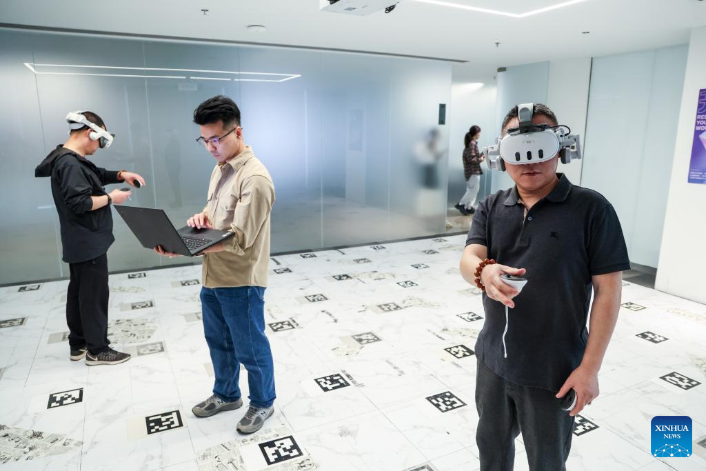 SHENZHEN, 22 abril, 2025 (Xinhua) -- Imagen del 4 de marzo de 2025 de trabajadore técnicos probando dispositivos de realidad virtual en el laboratorio de ciencia y tecnología de XVERSE, en el distrito de Nanshan de Shenzhen, en la provincia de Guangdong, en el sur de China. Aprovechando sus ventajas de ubicación únicas, sus sólidos cimientos industriales y un entorno de crecimiento abierto e inclusivo, la Gran Area de la Bahía de Guangdong-Hong Kong-Macao ha dado en los últimos años pasos firmes hacia nuevas competencias. (Xinhua/Mao Siqian)