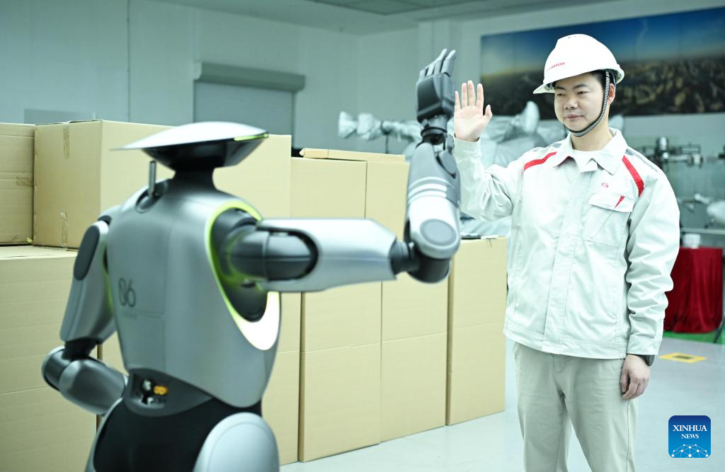 GUANGZHOU, 22 abril, 2025 (Xinhua) -- Imagen del 18 de marzo de 2025 de un trabajador técnico interactuando con GoMate, un robot humanoide, en el Centro de I+D de GAC, en Guangzhou, en la provincia de Guangdong, en el sur de China. Aprovechando sus ventajas de ubicación únicas, sus sólidos cimientos industriales y un entorno de crecimiento abierto e inclusivo, la Gran Area de la Bahía de Guangdong-Hong Kong-Macao ha dado en los últimos años pasos firmes hacia nuevas competencias. (Xinhua/Deng Hua)