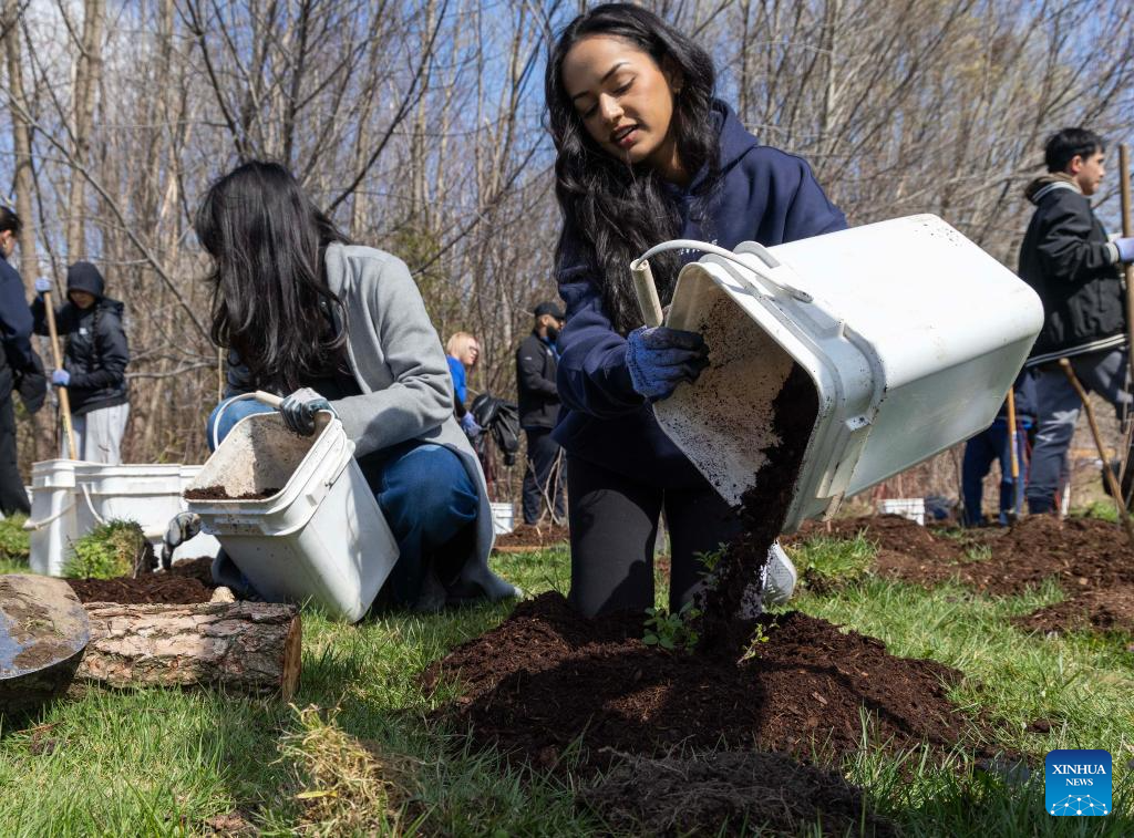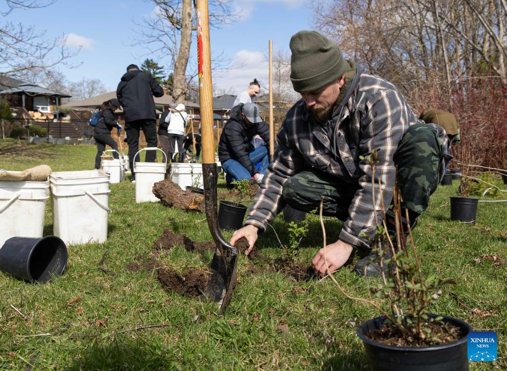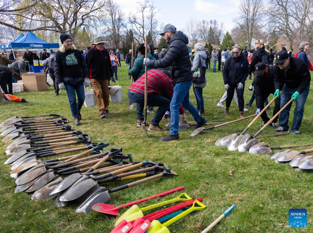 TORONTO, 22 abril, 2025 (Xinhua) -- Personas participan en un evento de plantación de árboles en un parque, en Toronto, Canadá, el 22 de abril de 2025. Unas 160 personas participaron en el evento de plantación de árboles aquí el martes para conmemorar el Día de la Tierra. (Xinhua/Zou Zheng)