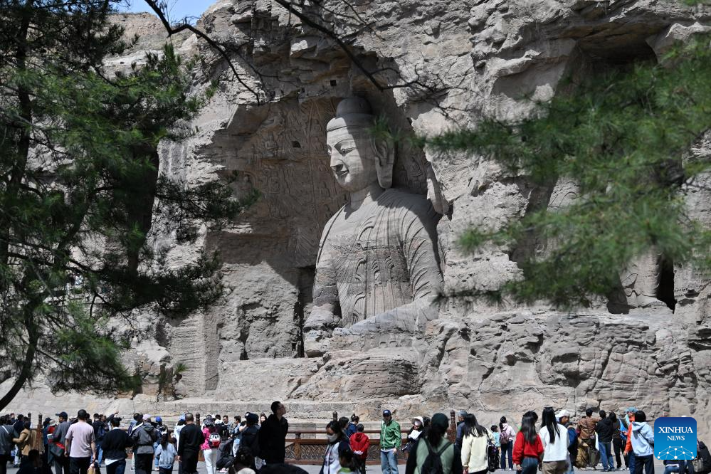 DATONG, 22 abril, 2025 (Xinhua) -- Imagen del 15 de abril de 2025 de turistas visitando las Grutas de Yungang, en Datong, en la provincia de Shanxi, en el norte de China. Las Grutas de Yungang se construyeron durante la Dinastía Wei del Norte (386-534). Desde 2003, este sitio declarado Patrimonio de la Humanidad por la UNESCO ha iniciado la digitalización de sus 45 cuevas principales y más de 59.000 estatuas de piedra amenazadas por la erosión. Se ha utilizado tecnología de vanguardia para registrar los detalles de las obras de arte budistas, lo que ha allanado el camino para su reconstrucción digital en 3D. (Xinhua/Zhan Yan)