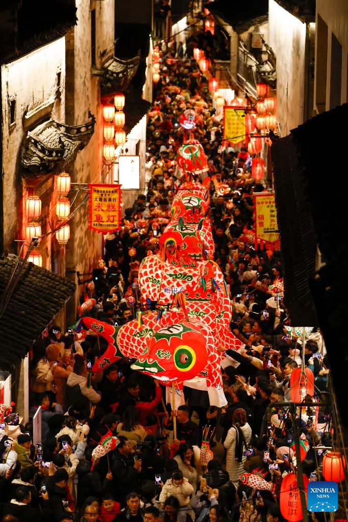 SHEXIAN, 22 abril, 2025 (Xinhua) -- Imagen del 31 de diciembre de 2024 de visitantes disfrutando de un espectáculo de linternas con forma de pez, en la aldea de Zhanqi del distrito de Shexian, en la ciudad de Huangshan, en la provincia de Anhui, en el este de China. Ubicado en el cruce de las montañas Huangshan y el río Xin'an, el distrito de Shexian, en la provincia de Anhui, en el este de China, ha conservado la esencia de la cultura y la arquitectura de estilo hui. (Xinhua/Shi Yalei)