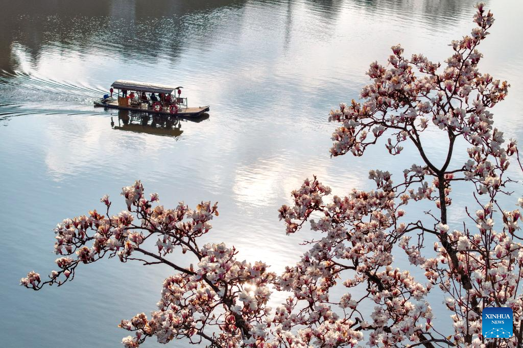 SHEXIAN, 22 abril, 2025 (Xinhua) -- Imagen tomada con un dron el 6 de marzo de 2025 de personas navegando en un bote turístico en el río Xin'an, en el distrito de Shexian, en la ciudad de Huangshan, en la provincia de Anhui, en el este de China. Ubicado en el cruce de las montañas Huangshan y el río Xin'an, el distrito de Shexian, en la provincia de Anhui, en el este de China, ha conservado la esencia de la cultura y la arquitectura de estilo hui. (Xinhua/Shi Yalei)
