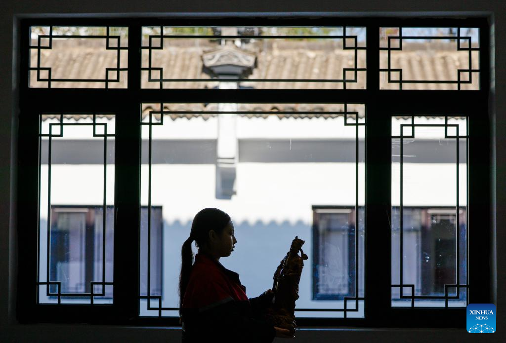 SHEXIAN, 22 abril, 2025 (Xinhua) -- Imagen del 27 de noviembre de 2024 de una estudiante observando un trabajo de tallado en madera durante una clase de formación práctica en una escuela, en el distrito de Shexian de la ciudad de Huangshan, en la provincia de Anhui, en el este de China. Ubicado en el cruce de las montañas Huangshan y el río Xin'an, el distrito de Shexian, en la provincia de Anhui, en el este de China, ha conservado la esencia de la cultura y la arquitectura de estilo hui. (Xinhua/Shi Yalei)