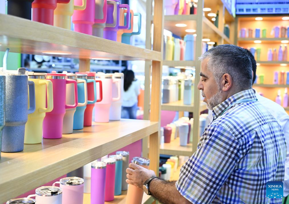 GUANGZHOU, 23 abril, 2025 (Xinhua) -- Un comprador extranjero observa productos de botellas de agua durante la 137ª Feria de Importación y Exportación de China, en Guangzhou, en la provincia de Guangdong, en el sur de China, el 23 de abril de 2025. La segunda fase de la 137ª Feria de Importación y Exportación de China, también conocida como la Feria de Cantón, centrada en muebles para el hogar de calidad, se inauguró el miércoles con más de 10.000 empresas expositoras. (Xinhua/Deng Hua)