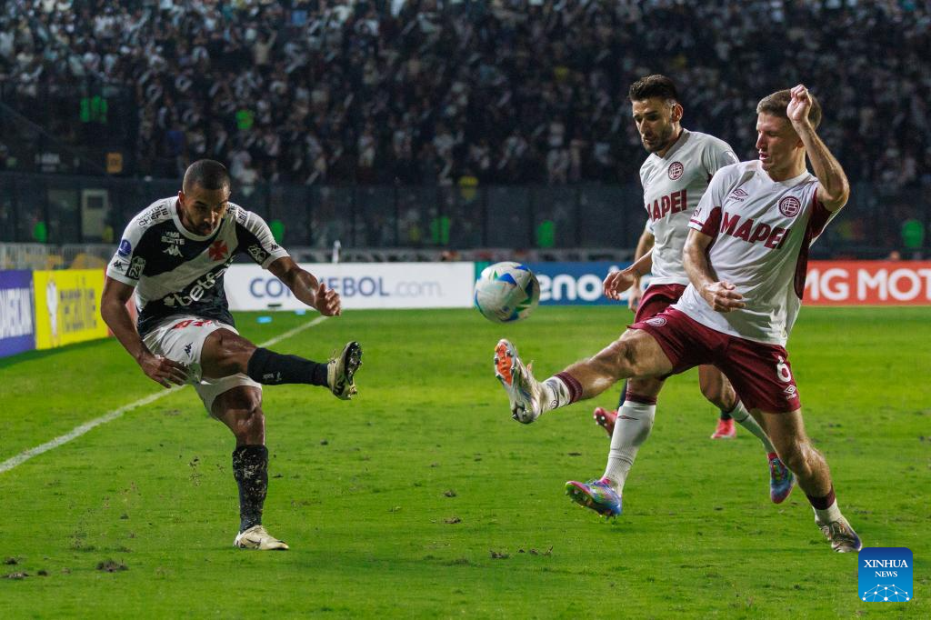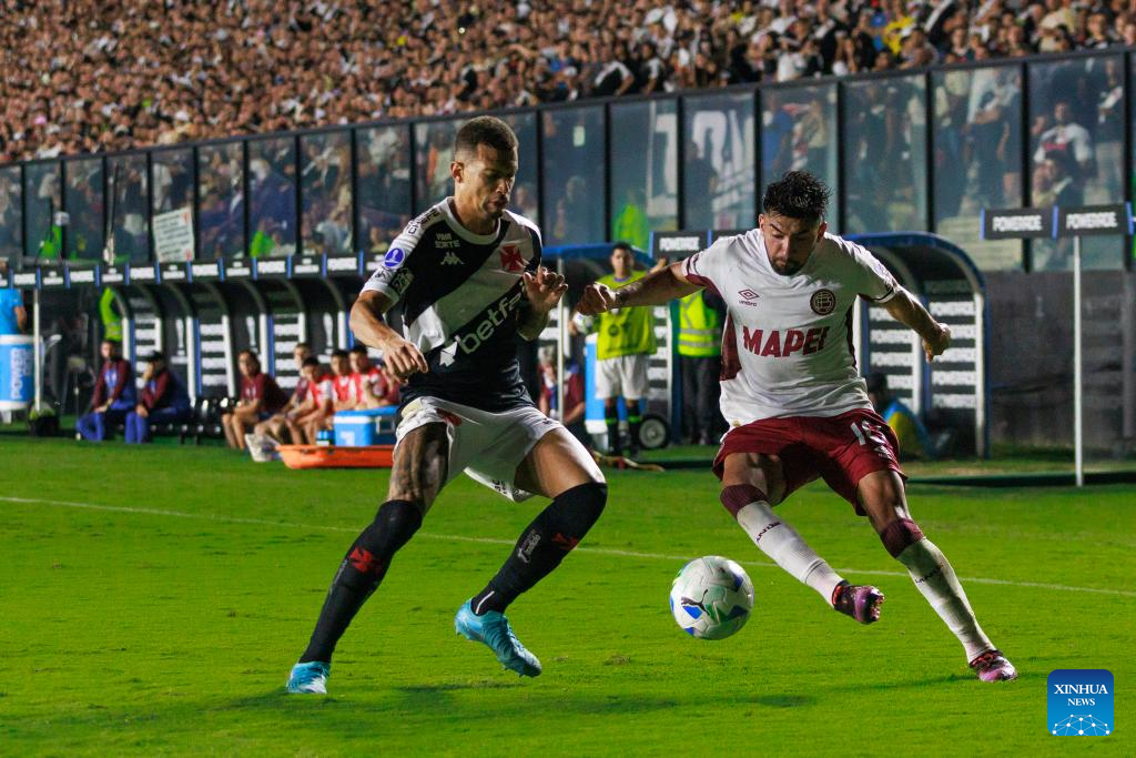 RIO DE JANEIRO, 23 abril, 2025 (Xinhua) -- Imagen del 22 de abril de 2025 del jugador Paulo Henrique (i), de Vasco da Gama de Brasil, disputando el balón con Sasha Marcich (d-frente), de Lanús de Argentina, durante el partido del grupo G de la jornada 3 de la Fase de Grupos de la Copa Conmebol Sudamericana, celebrado en el Estadio Sao Januário, en Río de Janeiro, Brasil. (Xinhua/Claudia Martini)