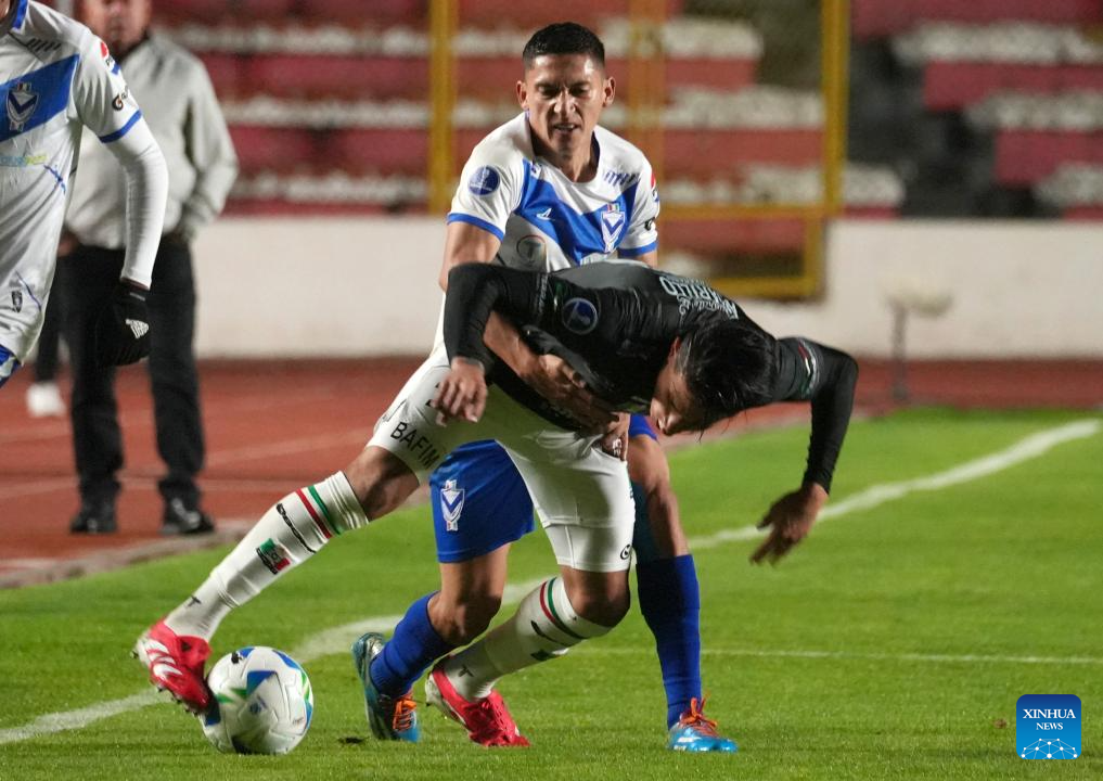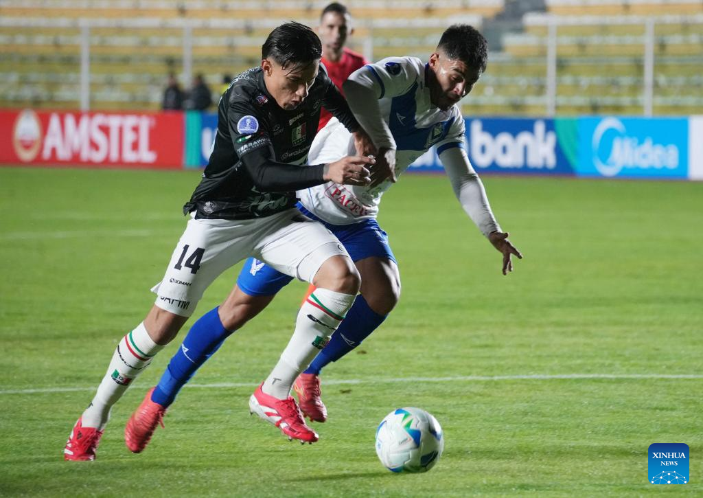 LA PAZ, 23 abril, 2025 (Xinhua) -- Imagen del 22 de abril de 2025 del jugador Sergio Villamíl (d), de GV San José, de Bolivia, disputando el balón con Jefry Zapata (i), de Once Caldas, de Colombia, durante el partido del grupo F de la jornada 3 de la Fase de Grupos de la Copa Conmebol Sudamericana, celebrado en el Estadio Hernando Siles, en la ciudad de La Paz, capital de Bolivia. (Xinhua/Javier Mamani)