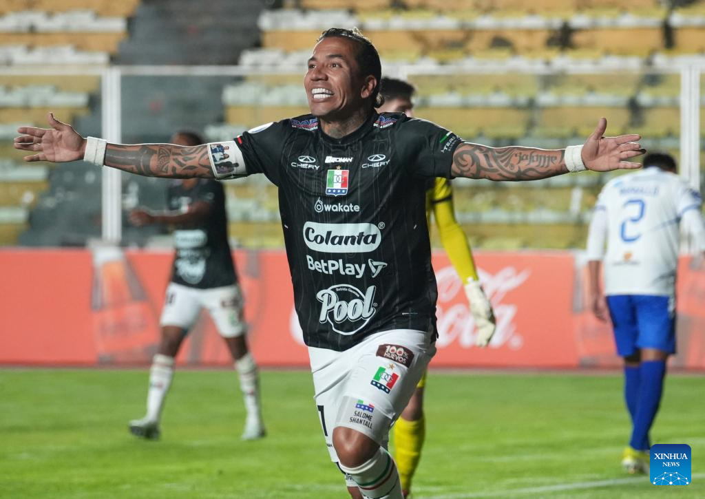 LA PAZ, 23 abril, 2025 (Xinhua) -- Imagen del 22 de abril de 2025 del jugador Dayro Moreno, de Once Caldas, de Colombia, festejando su anotación durante el partido del grupo F de la jornada 3 de la Fase de Grupos de la Copa Conmebol Sudamericana ante GV San José, de Bolivia, celebrado en el Estadio Hernando Siles, en la ciudad de La Paz, capital de Bolivia. (Xinhua/Javier Mamani)