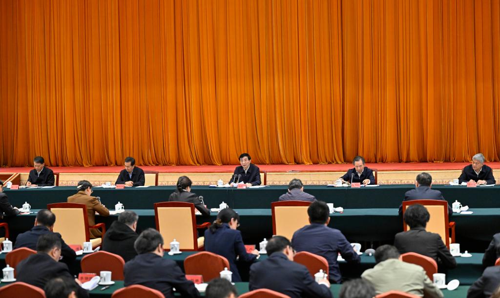 Wang Huning, miembro del Comité Permanente del Buró Político del Comité Central del Partido Comunista de China (PCCh) y presidente del Comité Nacional de la Conferencia Consultiva Política del Pueblo Chino (CCPPCh), asiste y habla en un seminario sobre el trabajo del Partido referente al frente único en la nueva era, en Beijing, capital de China, el 23 de abril de 2025. (Xinhua/Yin Bogu)