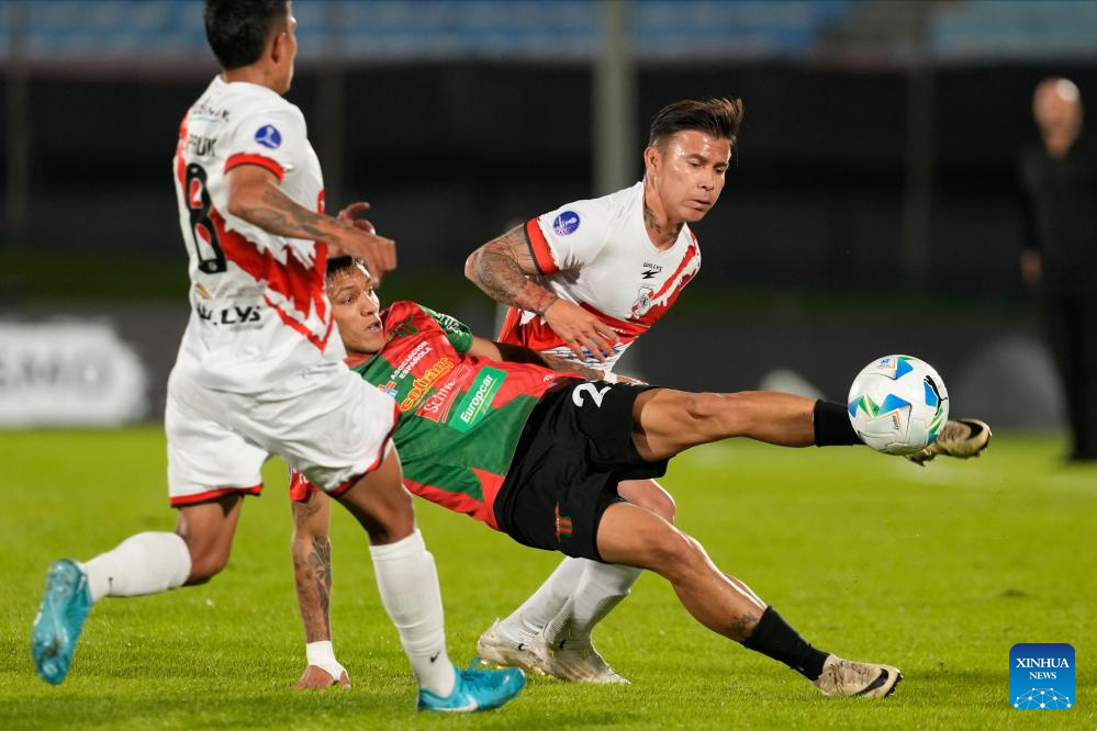 MONTEVIDEO, 23 abril, 2025 (Xinhua) -- Imagen del 22 de abril de 2025 del Fredy Martínez (c), de Boston River de Uruguay, disputando el balón con Diego Hoyos (atrás), y Luis Pavia (frente), de Nacional Potosí de Bolivia, durante un partido del grupo A de la jornada 3 de la Fase de Grupos de la Copa Conmebol Sudamericana, celebrado en el estadio Centenario, en Montevideo, capital de Uruguay. (Xinhua/Nicolás Celaya)