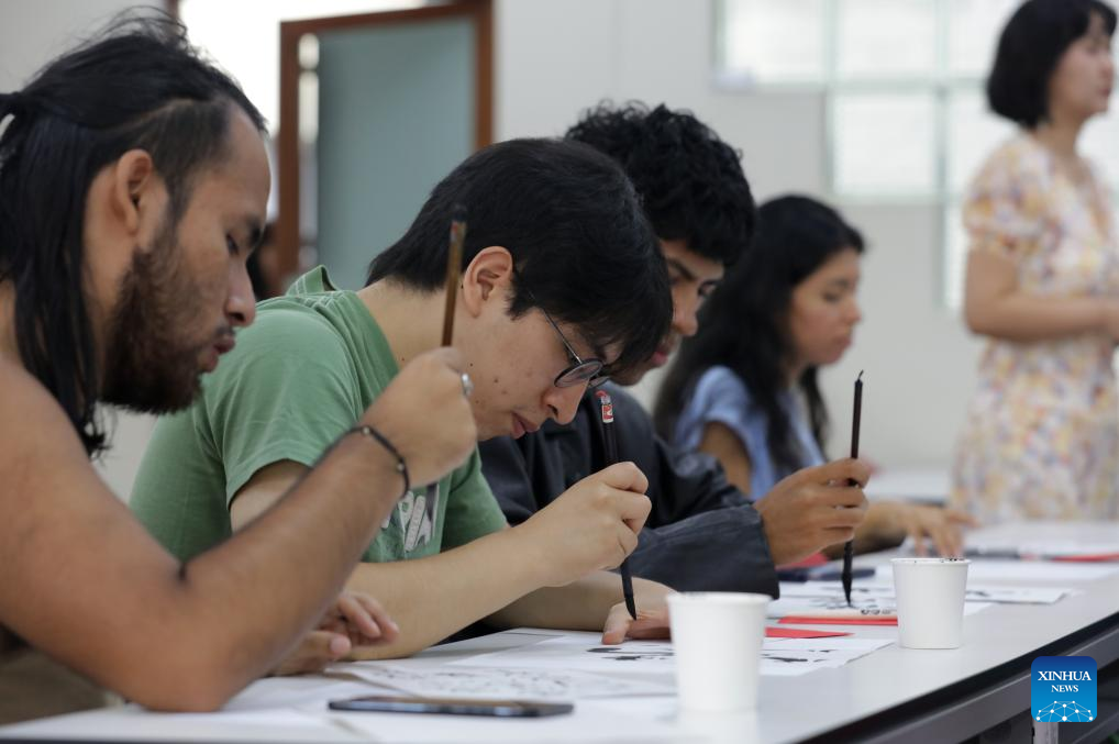 LIMA, 23 abril, 2025 (Xinhua) -- Imagen del 22 de abril de 2025 de alumnos realizando trazos en un taller de caligrafía china impartido por el Instituto Confucio de la Pontificia Universidad Católica del Perú (PUCP) en el marco de la celebración del Día Internacional de la Lengua China, en la Pontificia Universidad Católica, en Lima, Perú. Aprender el idioma chino es considerado por los estudiantes del Instituto Confucio de la PUCP como una oportunidad para acercarse a la cultura china, afirmó el miércoles la directora de la institución en el país sudamericano, Maribel Temoche. (Xinhua/Mariana Bazo)