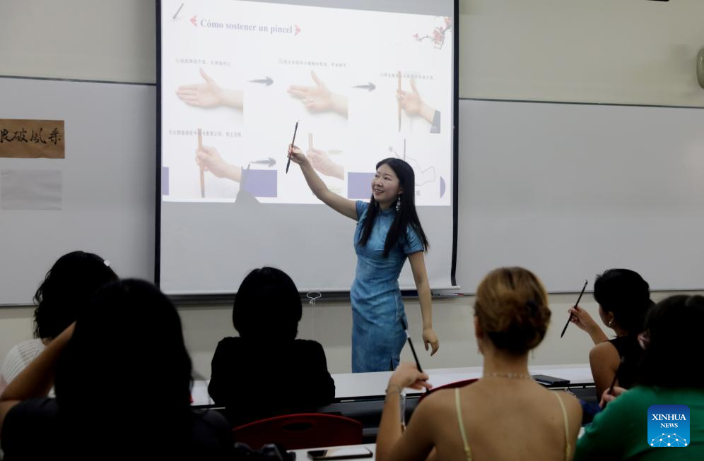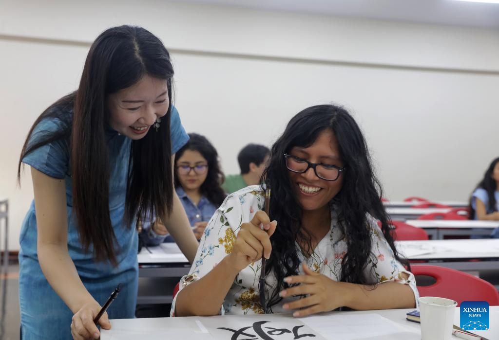 LIMA, 23 abril, 2025 (Xinhua) -- Imagen del 22 de abril de 2025 de la profesora, Liang Qing, del Instituto Confucio de la Pontificia Universidad Católica del Perú (PUCP), impartiendo un taller de caligrafía china en el marco de la celebración del Día Internacional de la Lengua China, en la Pontificia Universidad Católica, en Lima, Perú. Aprender el idioma chino es considerado por los estudiantes del Instituto Confucio de la PUCP como una oportunidad para acercarse a la cultura china, afirmó el miércoles la directora de la institución en el país sudamericano, Maribel Temoche. (Xinhua/Mariana Bazo)