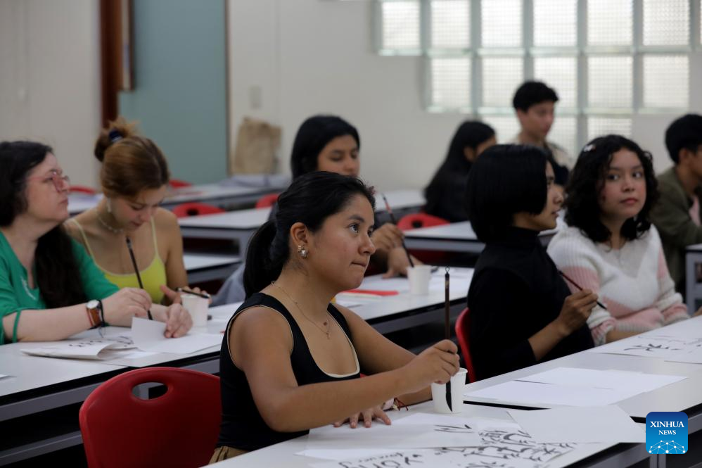 LIMA, 23 abril, 2025 (Xinhua) -- Imagen del 22 de abril de 2025 de alumnos participando en un taller de caligrafía china impartido por el Instituto Confucio de la Pontificia Universidad Católica del Perú (PUCP) en el marco de la celebración del Día Internacional de la Lengua China, en la Pontificia Universidad Católica, en Lima, Perú. Aprender el idioma chino es considerado por los estudiantes del Instituto Confucio de la PUCP como una oportunidad para acercarse a la cultura china, afirmó el miércoles la directora de la institución en el país sudamericano, Maribel Temoche. (Xinhua/Mariana Bazo)