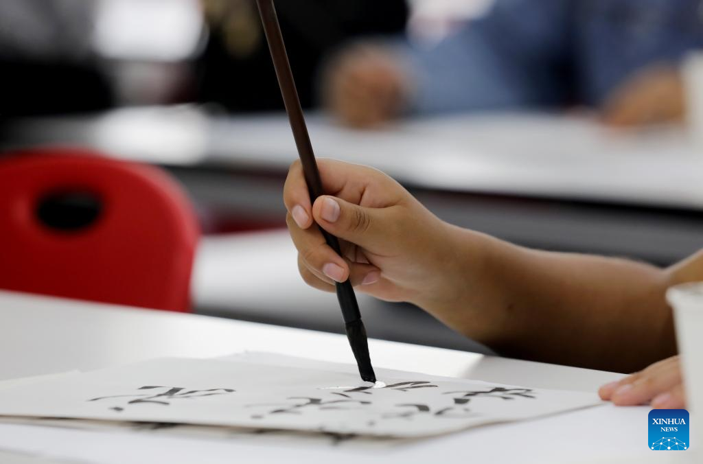 Imagen del 22 de abril de 2025 de un alumno realizando trazos en un taller de caligrafía china impartido por el Instituto Confucio de la Pontificia Universidad Católica del Perú (PUCP) en el marco de la celebración del Día Internacional de la Lengua China, en la Pontificia Universidad Católica, en Lima, Perú. Aprender el idioma chino es considerado por los estudiantes del Instituto Confucio de la PUCP como una oportunidad para acercarse a la cultura china, afirmó el miércoles la directora de la institución en el país sudamericano, Maribel Temoche. (Xinhua/Mariana Bazo)