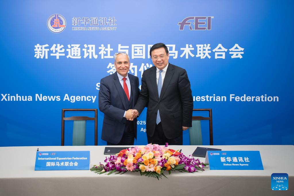 BEIJING, 24 abril, 2025 (Xinhua) -- El presidente de la Agencia de Noticias Xinhua, Fu Hua, e Ingmar De Vos, presidente de la Federación Ecuestre Internacional (FEI) y miembro del Comité Olímpico Internacional, asisten a la ceremonia de firma de un memorándum de entendimiento, en Beijing, capital de China, el 24 de abril de 2025. La Agencia de Noticias Xinhua y la FEI firmaron el jueves en Beijing un memorándum de entendimiento para profundizar su cooperación en el ámbito informativo. (Xinhua/Li Tao)