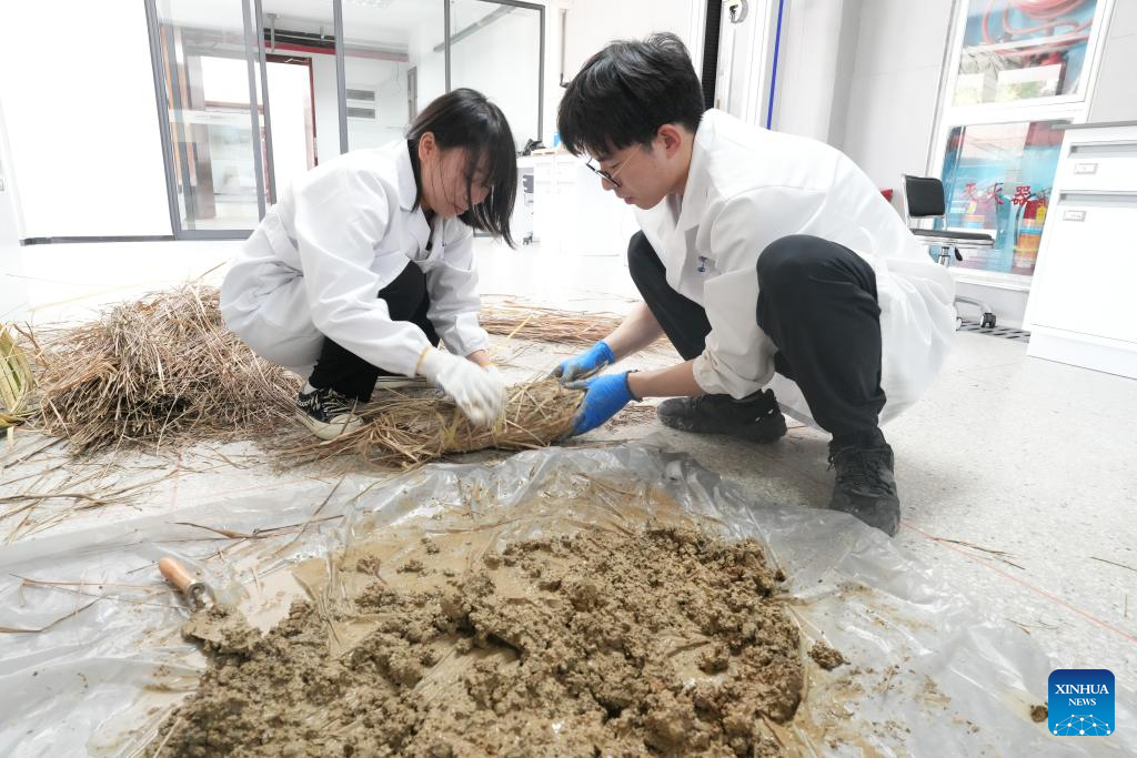 HANGZHOU, 24 abril, 2025 (Xinhua) -- Imagen del 18 de abril de 2025 de investigadores realizando experimentos con "barro envuelto en hierba", una técnica de construcción del sistema de conservación del agua de la ciudad antigua de Liangzhu, en un centro de pruebas de las Ruinas Arqueológicas de la Ciudad de Liangzhu, en Hangzhou, en la provincia de Zhejiang, en el este de China. El Tercer Foro de Alto Nivel de la UNESCO para los Museos está programado del 23 al 25 de abril en Hangzhou, y reunirá a expertos de más de 60 países y regiones para debatir la experiencia y las prácticas de cómo los museos desempeñan un papel en la protección del patrimonio cultural y el uso de las nuevas tecnologías. (Xinhua/Weng Xinyang)
