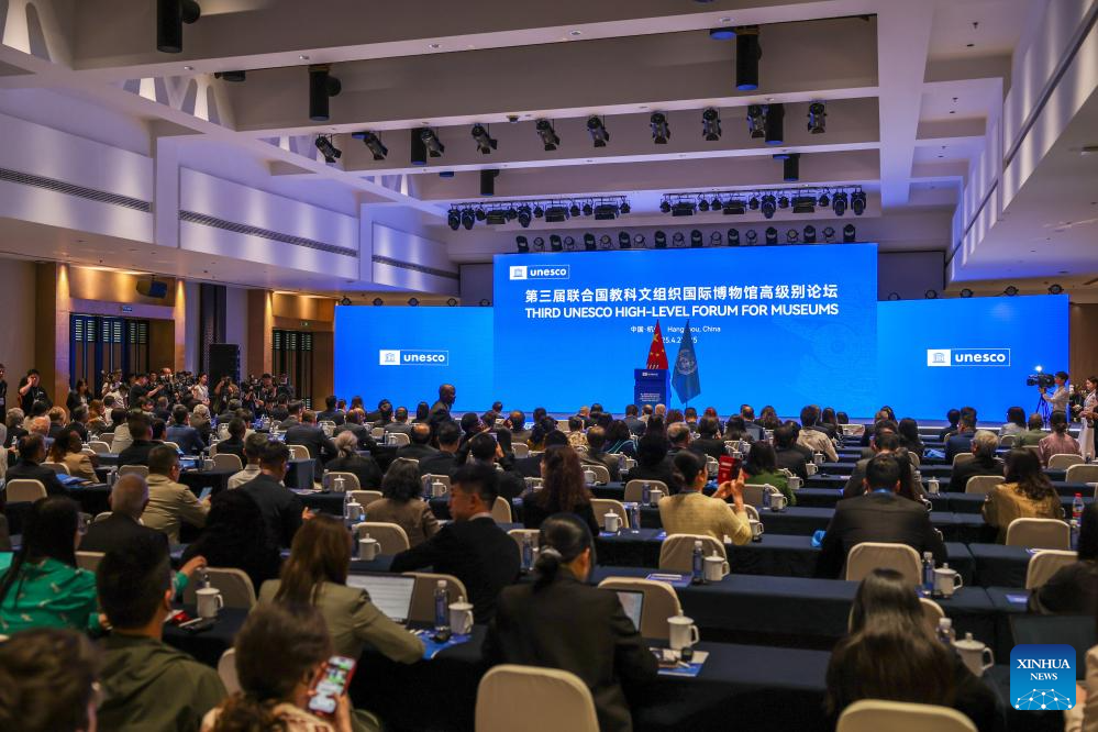 HANGZHOU, 24 abril, 2025 (Xinhua) -- Imagen del 23 de abril de 2025 de una escena del Tercer Foro de Alto Nivel de la UNESCO para los Museos, llevado a cabo en Hangzhou, en la provincia de Zhejiang, en el este de China. El Tercer Foro de Alto Nivel de la UNESCO para los Museos está programado del 23 al 25 de abril en Hangzhou, y reunirá a expertos de más de 60 países y regiones para debatir la experiencia y las prácticas de cómo los museos desempeñan un papel en la protección del patrimonio cultural y el uso de las nuevas tecnologías. (Xinhua/Jiang Han)