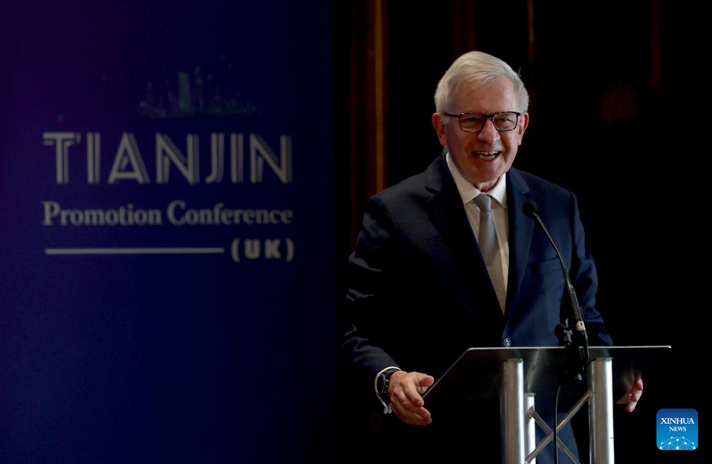 LONDRES, 24 abril, 2025 (Xinhua) -- Sherard Cowper-Coles, presidente del Consejo Empresarial China-Reino Unido, pronuncia un discurso en un evento de promoción de inversión y negocios para la ciudad portuaria de Tianjin, en el norte de China, celebrado en Londres, Reino Unido, el 24 de abril de 2025. El jueves se celebró en el centro de Londres un evento de promoción de inversión y negocios para la ciudad portuaria de Tianjin, en el norte de China, con una entusiasta participación de actores tanto chinos como británicos. (Xinhua/Li Ying)