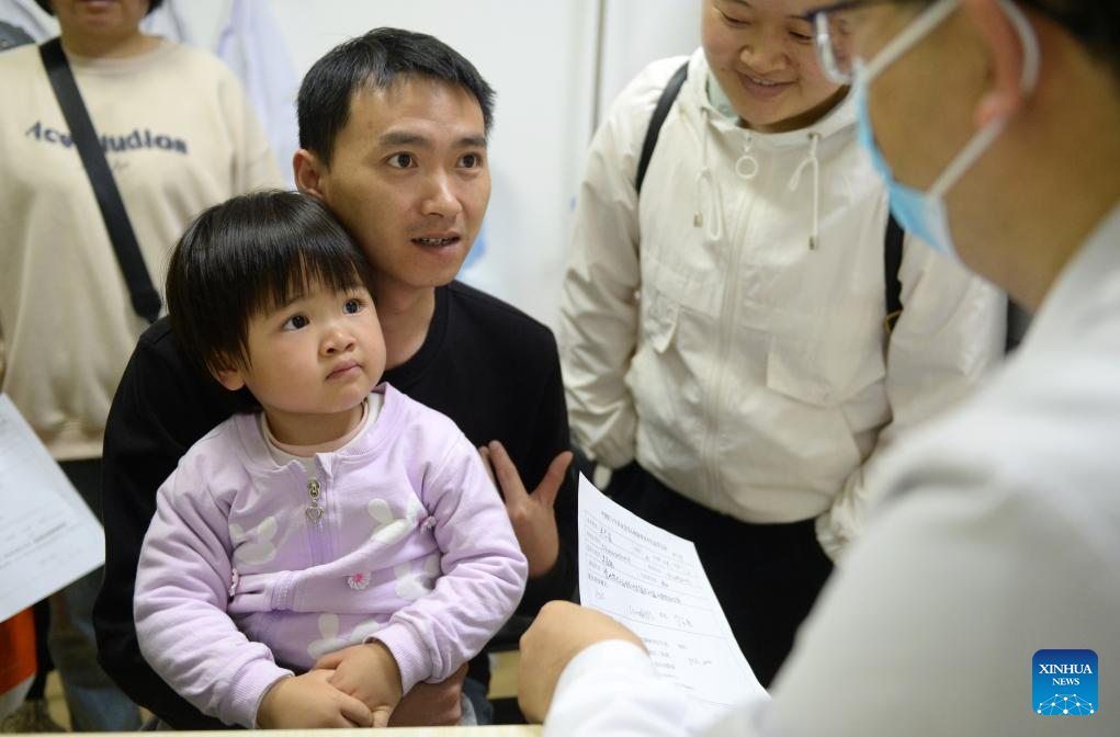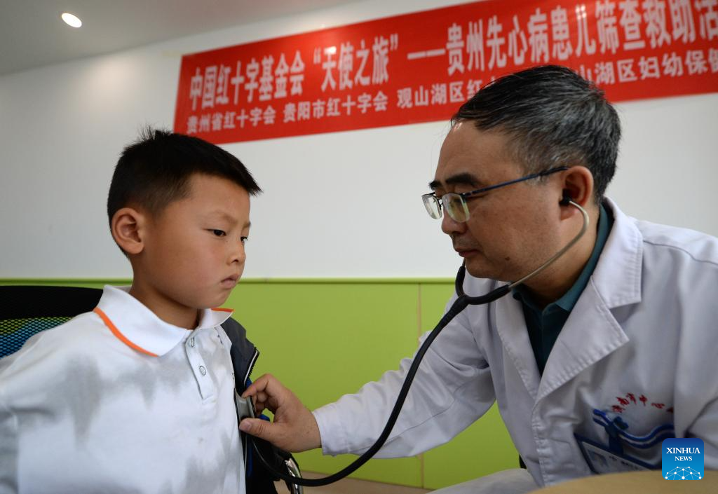 GUIYANG, 25 abril, 2025 (Xinhua) -- Imagen del 22 de abril de 2025 de un experto médico examinando a un niño en un hospital, en Guiyang, en la provincia de Guizhou, en el suroeste de China. Recientemente, un programa de detección de cardiopatías congénitas (CPC) fue implementado en la provincia de Guizhou. Los niños que son sometidos a pruebas de detección según las indicaciones quirúrgicas pueden recibir tratamiento quirúrgico gratuito. El programa de detección, lanzado por la Fundación de la Cruz Roja de China, ha apoyado a casi 10.000 niños nacidos con CPC ofreciéndoles cirugías gratuitas. (Xinhua/Liu Yongzhen)