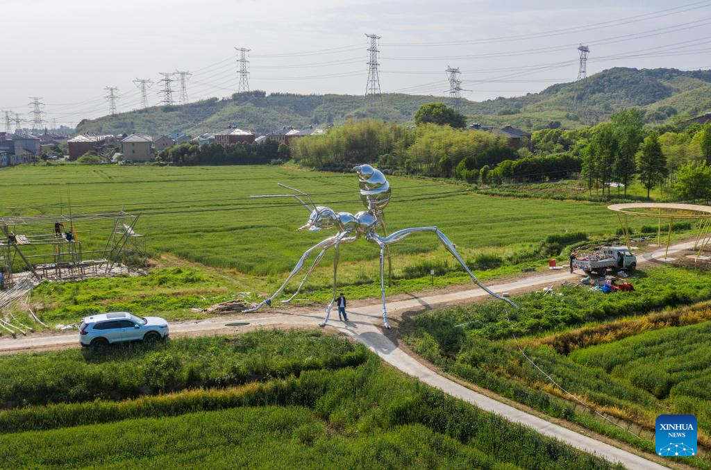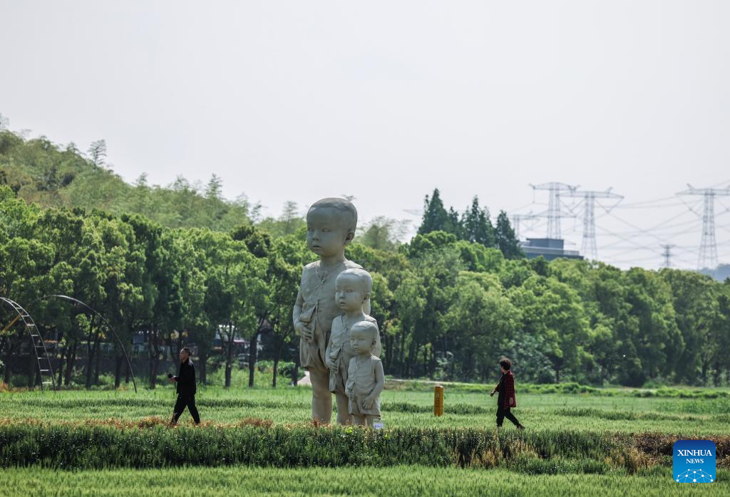 HUZHOU, 25 abril, 2025 (Xinhua) -- Imagen del 25 de abril de 2025 de una obra de arte exhibida en los campos, en el poblado de Donglin, en la ciudad de Huzhou de la provincia de Zhejiang, en el este de China. Un evento de arte terrestre comenzó el viernes en los campos de trigo del poblado de Donglin. Profesores y estudiantes de diversas academias de bellas artes chinas formaron el equipo creativo central, produciendo 42 piezas de arte terrestre. Tomando la vasta tierra como lienzo y los elementos naturales como entorno, los artistas integraron hábilmente diversas formas de arte, como las instalaciones de arte y el paisajismo en los campos y las aldeas, permitiendo a los turistas y a la población local disfrutar de las obras de arte en el campo. (Xinhua/Xu Yu)