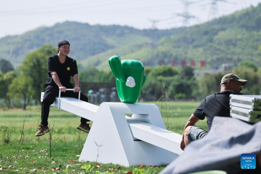 HUZHOU, 25 abril, 2025 (Xinhua) -- Trabajadores experimentan una obra de arte en forma de balancín en los campos, en el poblado de Donglin, en la ciudad de Huzhou de la provincia de Zhejiang, en el este de China, el 25 de abril de 2025. Un evento de arte terrestre comenzó el viernes en los campos de trigo del poblado de Donglin. Profesores y estudiantes de diversas academias de bellas artes chinas formaron el equipo creativo central, produciendo 42 piezas de arte terrestre. Tomando la vasta tierra como lienzo y los elementos naturales como entorno, los artistas integraron hábilmente diversas formas de arte, como las instalaciones de arte y el paisajismo en los campos y las aldeas, permitiendo a los turistas y a la población local disfrutar de las obras de arte en el campo. (Xinhua/Xu Yu)