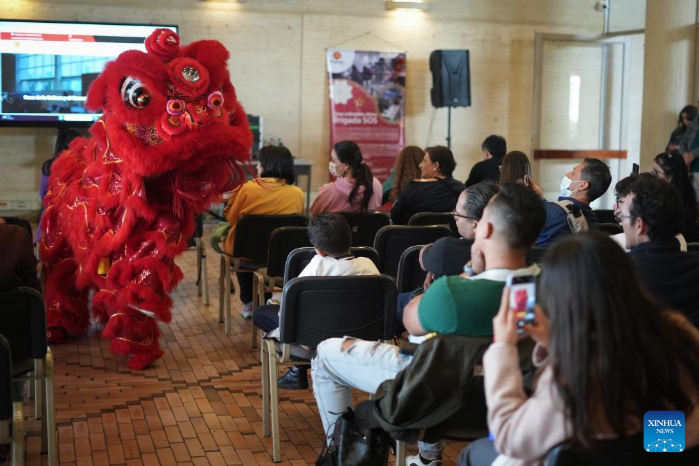 Imagen del 26 de abril de 2025 de personas participando en una muestra cultural durante un concurso realizado en el marco del Festival de la Lengua China celebrado en la Biblioteca Pública Virgilio Barco, en Bogotá, capital de Colombia. El evento, gratuito y abierto a todas las edades, se basó en la presentación de las capacidades lingüísticas de los estudiantes de la Casa Colombo China, una organización que imparte clases tanto del idioma como de artes marciales y además brinda asesorías en temas de comercio entre ambos países. (Xinhua/Andrés Moreno)