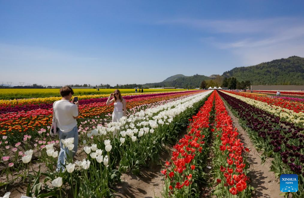 ABBOTSFORD, 26 abril, 2025 (Xinhua) -- Imagen del 25 de abril de 2025 de personas tomando fotografías entre hileras de tulipanes, en Abbotsford, Columbia Británica, Canadá. Un festival del tulipán, con más de 100 variedades de tulipanes, se celebra en Abbotsford hasta el 11 de mayo. (Xinhua/Liang Sen)