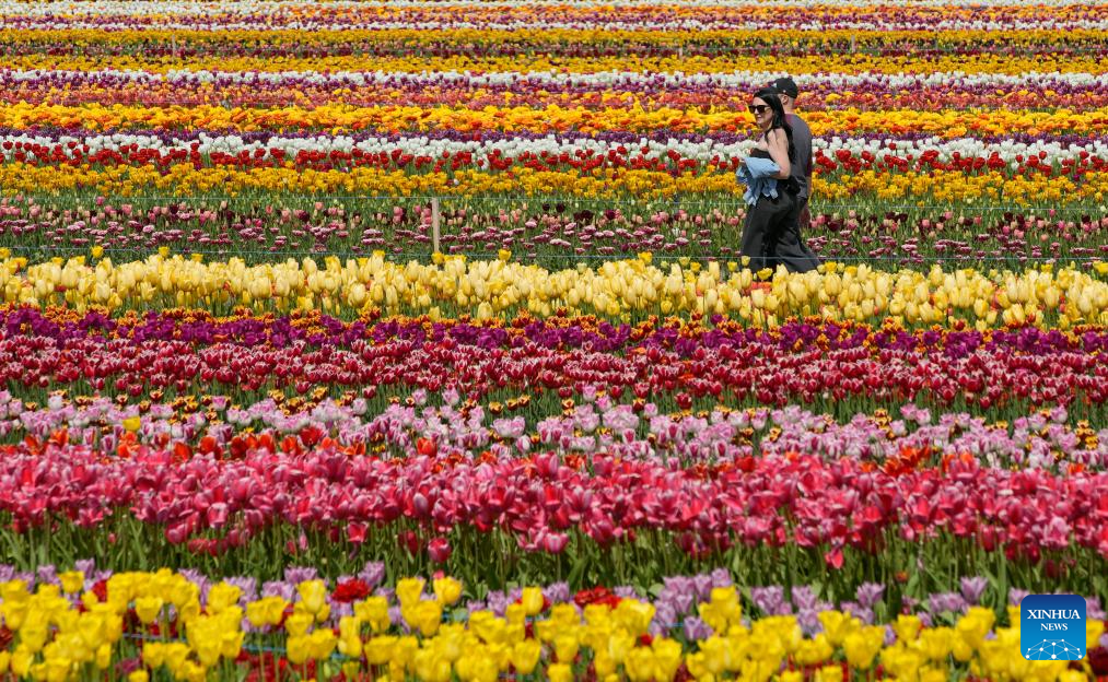 ABBOTSFORD, 26 abril, 2025 (Xinhua) -- Imagen del 25 de abril de 2025 de personas caminando entre hileras de tulipanes, en Abbotsford, Columbia Británica, Canadá. Un festival del tulipán, con más de 100 variedades de tulipanes, se celebra en Abbotsford hasta el 11 de mayo. (Xinhua/Liang Sen)