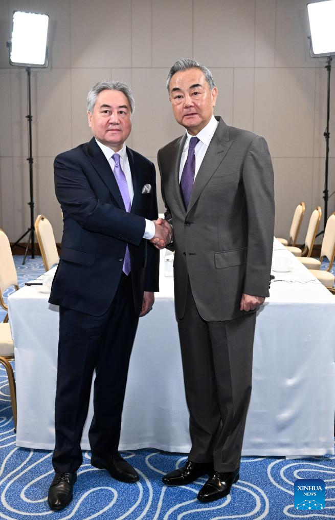 Wang Yi, miembro del Buró Político del Comité Central del Partido Comunista de China y ministro de Relaciones Exteriores chino, se reúne con Jeenbek Kulubaev, ministro de Relaciones Exteriores de Kirguistán, en Almaty, Kazajistán, el 26 de abril de 2025. (Xinhua/Li Renzi)