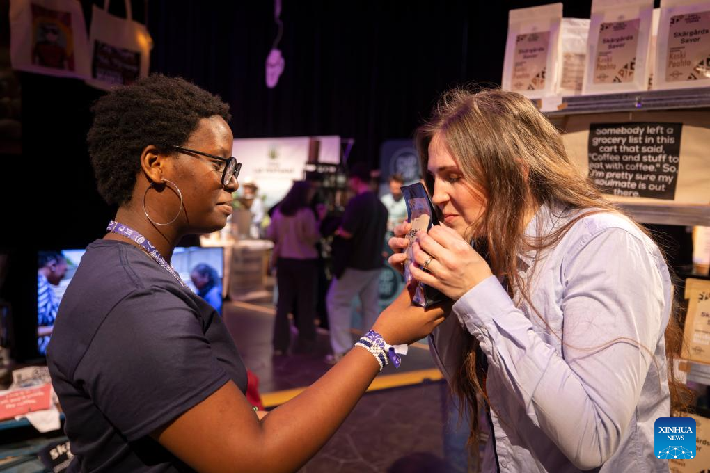 HELSINKI, 27 abril, 2025 (Xinhua) -- Imagen del 26 de abril de 2025 de una mujer oliendo granos de café durante el Festival del Café de Helsinki 2025, en Helsinki, Finlandia. El Festival del Café de Helsinki 2025 se celebra aquí del 25 al 27 de abril, con unos 60 expositores que muestran sus productos de café, bebidas de té, aparatos de café y una variedad de productos. (Xinhua/Matti Matikainen)