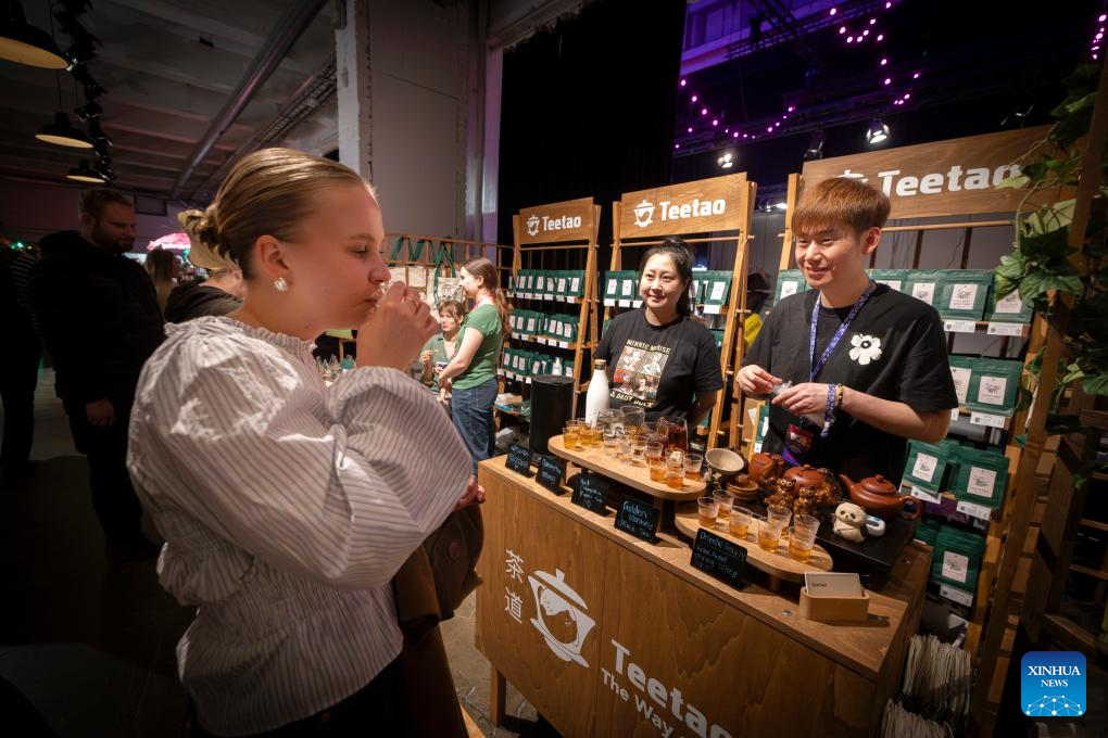 HELSINKI, 27 abril, 2025 (Xinhua) -- Imagen del 26 de abril de 2025 de una mujer probando bebidas de té exhibidas por un expositor chino durante el Festival del Café de Helsinki 2025, en Helsinki, Finlandia. El Festival del Café de Helsinki 2025 se celebra aquí del 25 al 27 de abril, con unos 60 expositores que muestran sus productos de café, bebidas de té, aparatos de café y una variedad de productos. (Xinhua/Matti Matikainen)