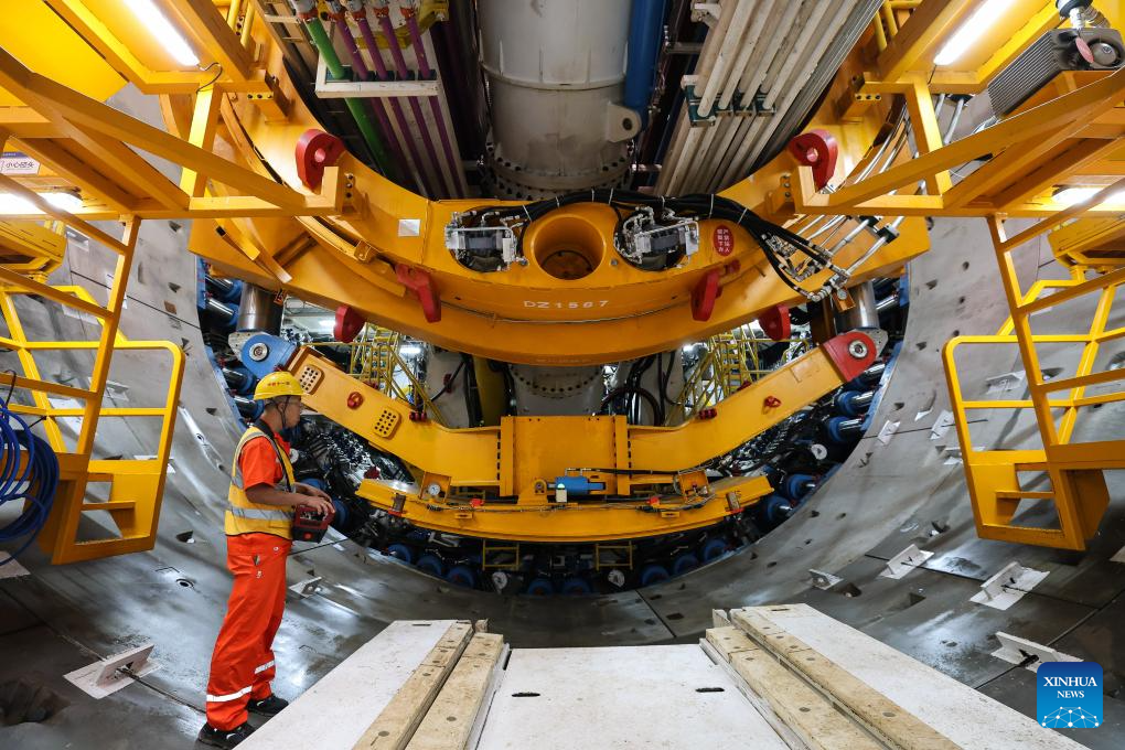 GUANGZHOU, 28 abril, 2025 (Xinhua) -- Un empleado opera una tuneladora de escudo gigante en la obra de la línea de enlace que conecta las estaciones de ferrocarril de Guangzhou y Guangzhou Sur, en Guangzhou, en la provincia de Guangdong, en el sur de China, el 28 de abril de 2025. La construcción de la línea de enlace se ha acelerado recientemente. Esta línea mejorará la accesibilidad del transporte público de la ciudad una vez finalizada. (Xinhua/Liu Dawei)