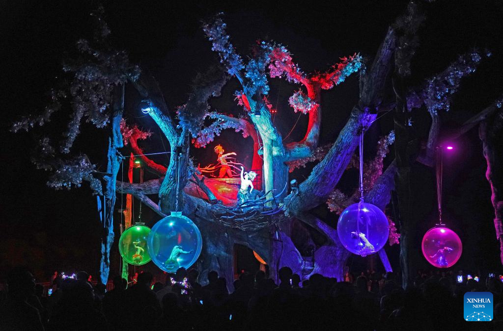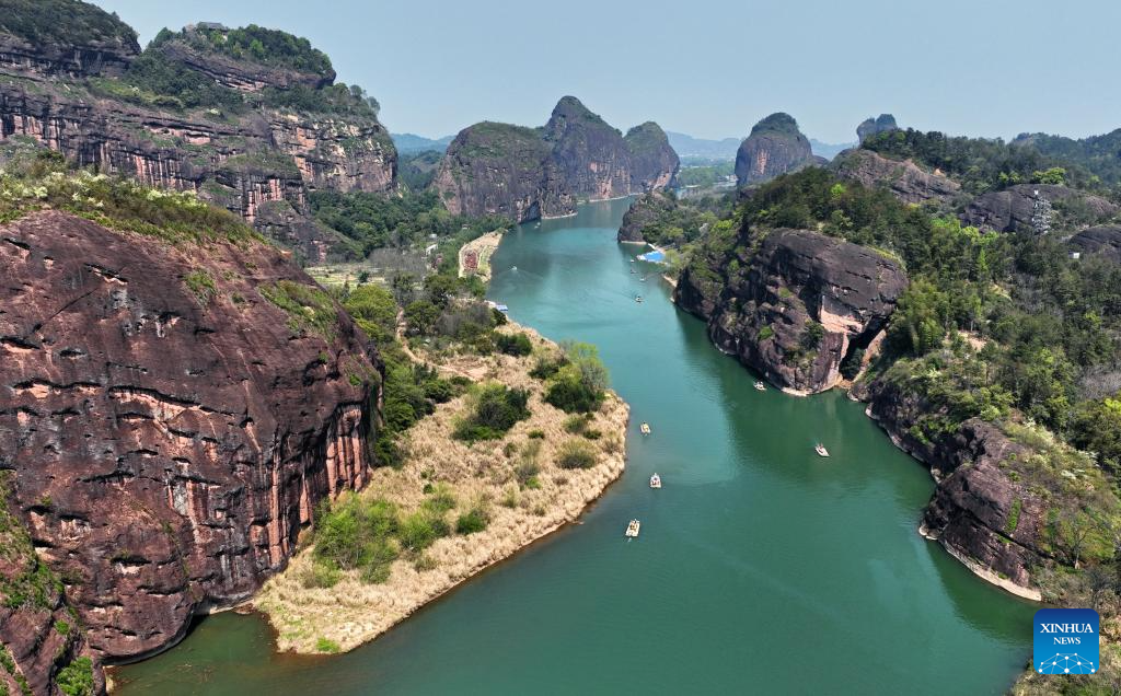YINGTAN, 28 abril, 2025 (Xinhua) -- Imagen del 24 de marzo de 2025 de turistas disfrutando de un espectáculo en el sitio escénico de la Montaña Longhu, en Yingtan, en la provincia de Jiangxi, en el este de China. Declarada Geoparque Global por la UNESCO, la Montaña Longhu de la provincia de Jiangxi es un sitio natural incluido en la Lista del Patrimonio Mundial y uno de los lugares de nacimiento del taoísmo en China. (Xinhua/Wan Xiang)