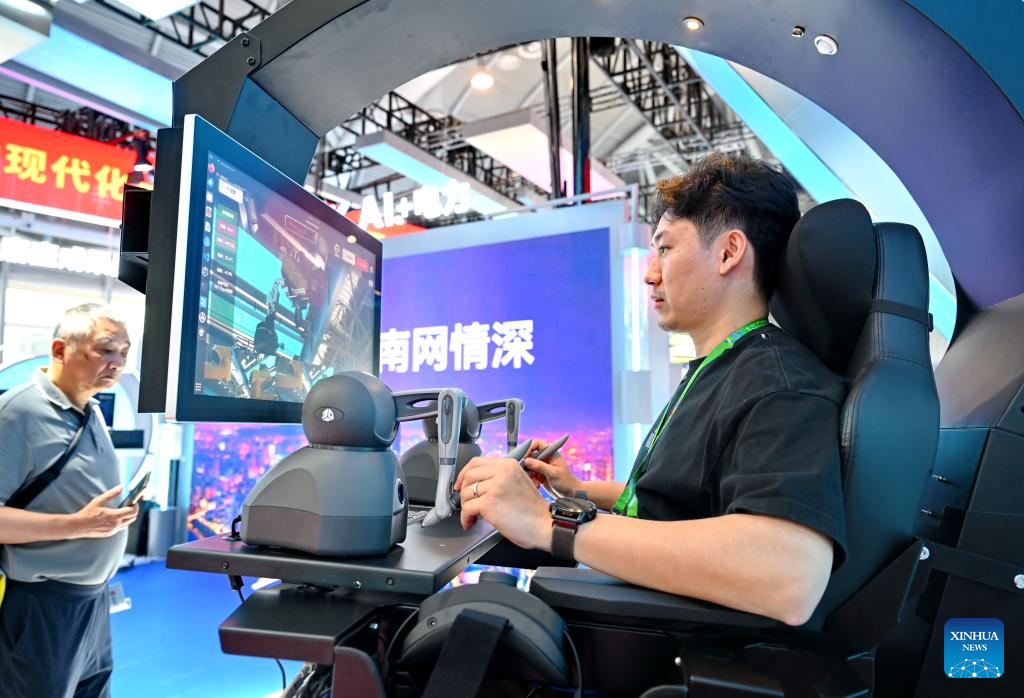 FUZHOU, 28 abril, 2025 (Xinhua) -- Un empleado demuestra la operación de un robot en la zona de experiencias de la VIII Cumbre China Digital, en Fuzhou, en la provincia de Fujian, en el sureste de China, el 28 de abril de 2025. Con la asistencia de más de 300 instituciones profesionales, la VIII Cumbre China Digital abrió su zona de experiencias a los visitantes profesionales el lunes, mostrando los logros de la transformación digital del país en medio de un sólido crecimiento en el sector digital. (Xinhua/Lin Shanchuan)