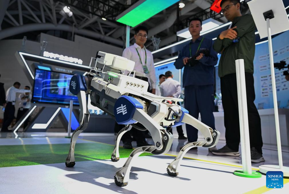 FUZHOU, 28 abril, 2025 (Xinhua) -- Un empleado opera un perro robot en la zona de experiencias de la VIII Cumbre China Digital, en Fuzhou, en la provincia de Fujian, en el sureste de China, el 28 de abril de 2025. Con la asistencia de más de 300 instituciones profesionales, la VIII Cumbre China Digital abrió su zona de experiencias a los visitantes profesionales el lunes, mostrando los logros de la transformación digital del país en medio de un sólido crecimiento en el sector digital. (Xinhua/Lin Shanchuan)